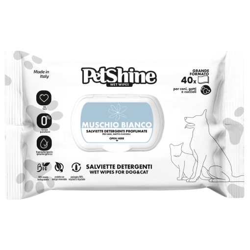 Se estiver a passear com o seu animal de estimação ou em viagem e ele se suja, precisa de ter algo perto para ajudá-lo a limpá-lo rápida e eficazmente, deve usar as Petshine Toalhitas com fragrância White Musk. Este produto foi concebido para limpeza profunda e cuidado diário da pele do seu amigo peludo graças à sua fórmula refrescante, sem álcool.